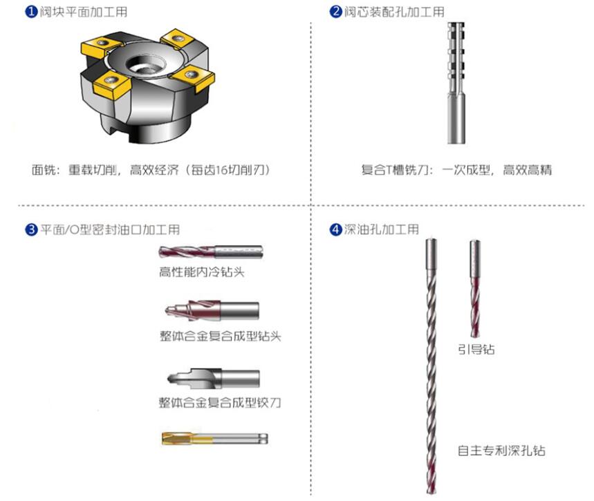 液压阀块的加工特点是孔阶梯多、成型面多、相贯孔多、尺寸精度要求严,孔的表面粗糙度及直线度要求高。阿诺设计的整体硬质合金成型刀具和焊接硬质合金成型刀具,将多把孔加工刀具复合成一把,能够满足阶梯孔的尺寸精度和表面粗糙度要求。对于阀块插装阀孔密封面加工,有着丰富的刀具应用经验。